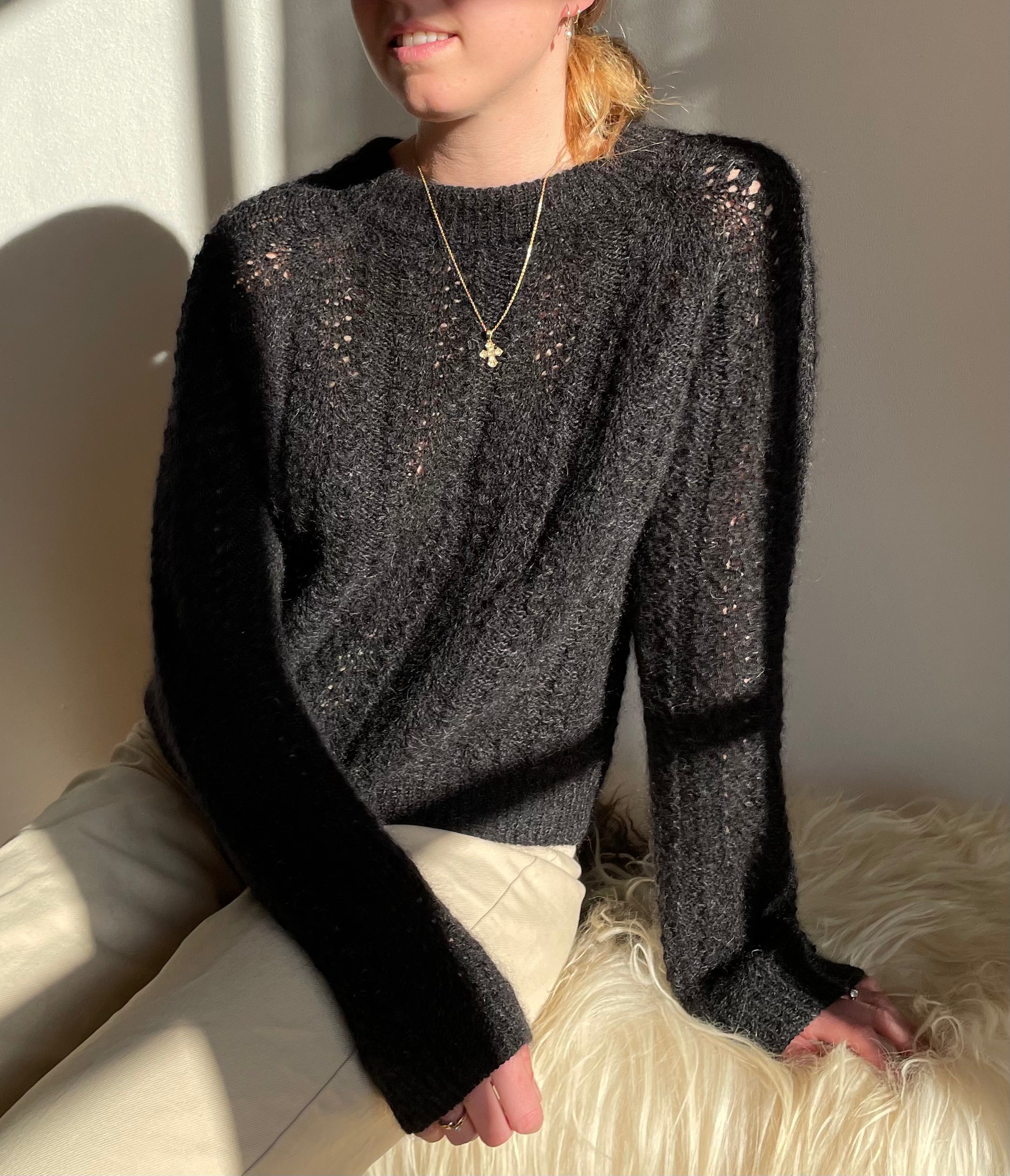 Sweateren strikkes oppefra og ned på rundpind. Først slås masker op til halskanten, der strikkes i drejet rib. Herefter inddeles maskerne med 8 markører, og der strikkes vendepinde. Bærestykket vokser gennem raglan-udtagninger, der laves omkring maskemarkørerne.