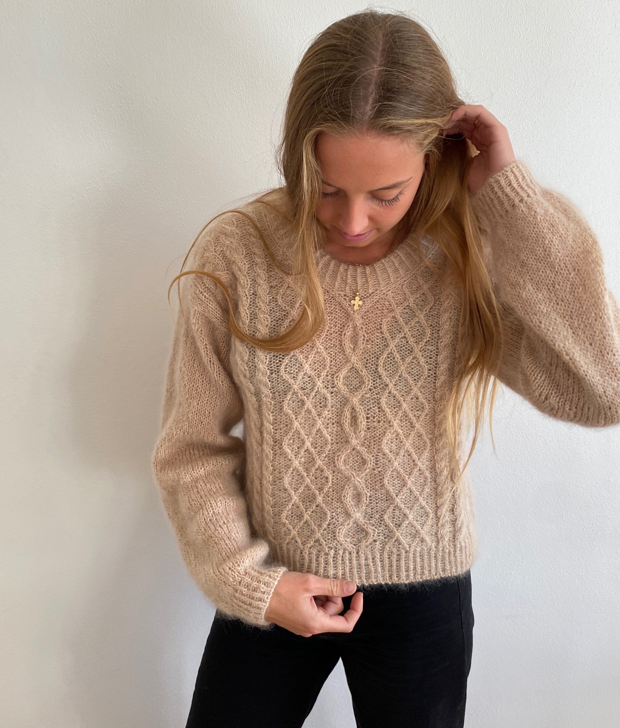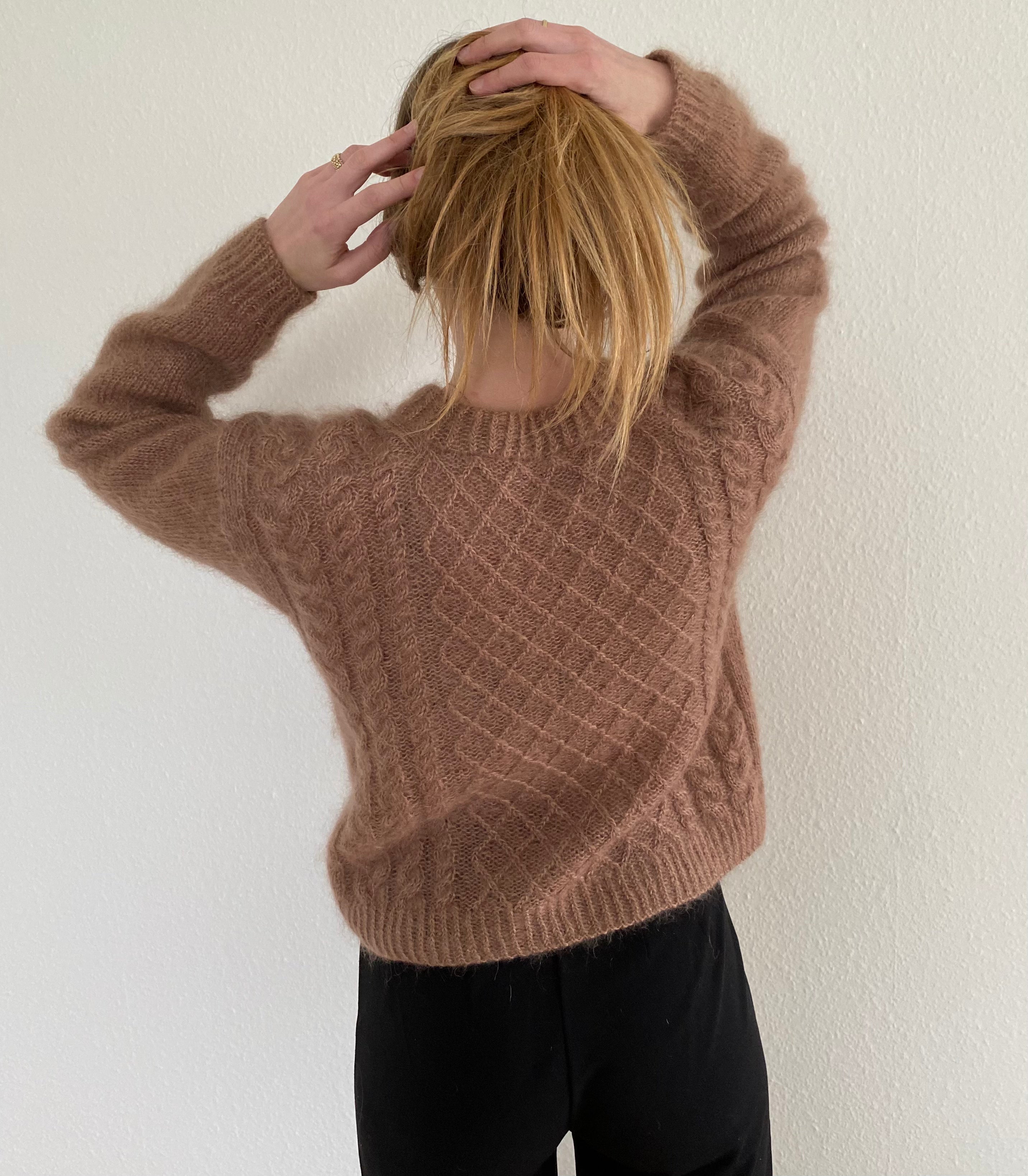 Denne opskrift kombinerer forskellige former for flet, snoninger og strukturstrik til en sweater der strikkes oppefra og ned. Først strikkes rygstykket, hvorefter der samles masker op til skuldre. Forstykket og rygstykket samles og der strikkes på rundpind til sweateren når til fulde længde. Afslutningsvist strikkes den dobbeltfoldede halskant og ærmerne strikkes i glatstrik, med vendepinde for at forme skulderkuplerne.