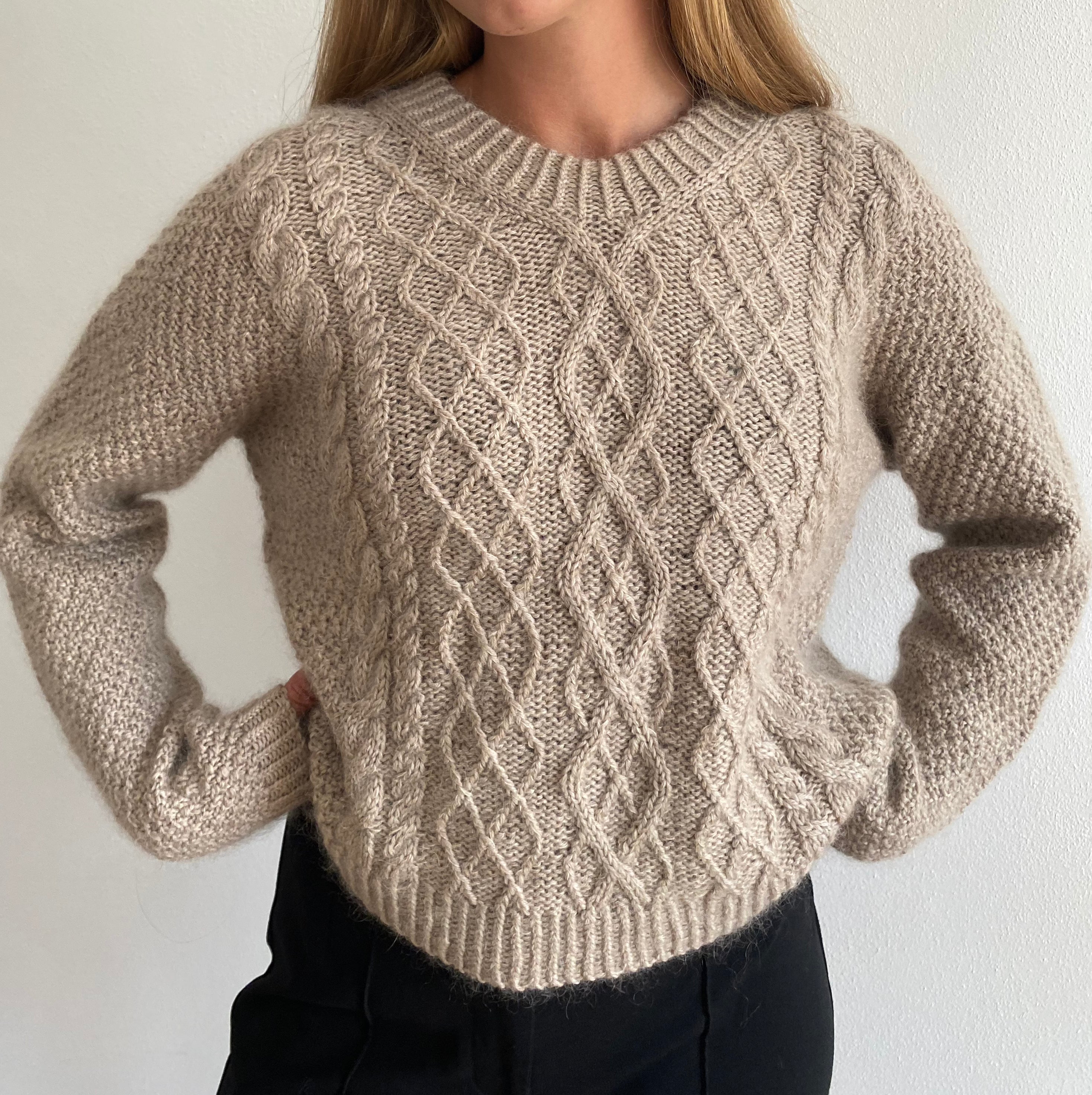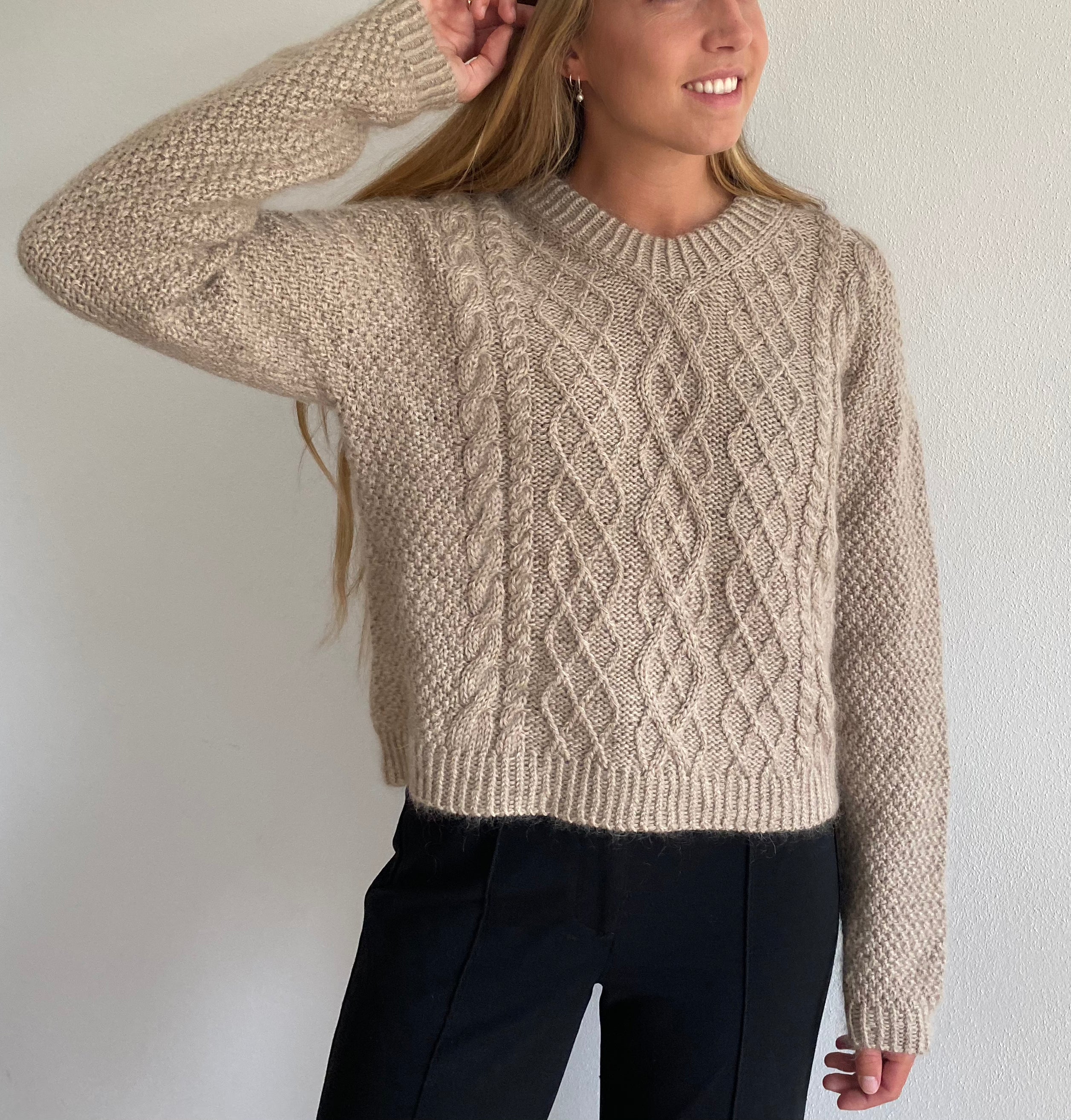 Mayflower Easy Care Classic (50 g = 106 m) sammen med Mayflower Super Kid Silk (25 g = 195 m). Den på billederne viste sweater er strikket i Easy Care fv. 244 ørkensand sammen med Super Kid Silk fv. 98 nougat.