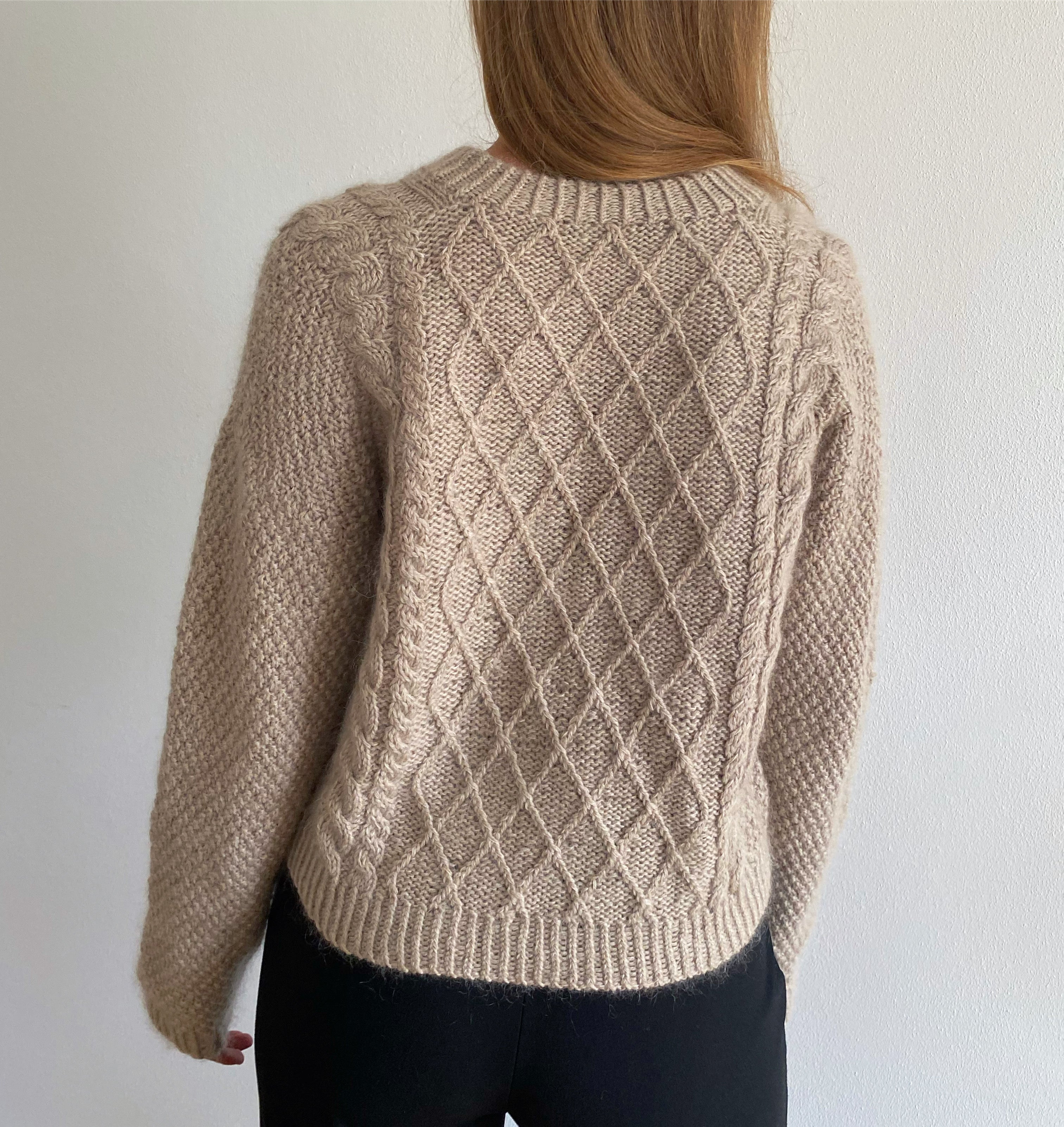 Sweateren strikkes med paneler på for- og bagsiden der har snoninger og strukturstrik, mens resten af sweateren, svarende til ærmer samt siderne af sweateren strikkes i dobbelt perlestrik. Mønsteret i struktur-panelerne er beskrevet gennem diagrammer hvor hver 1x1 firkant afbilder 1 maske. Opskriften indeholder både en guide til bagsiden med store og små ruder, som vist er på billederne.