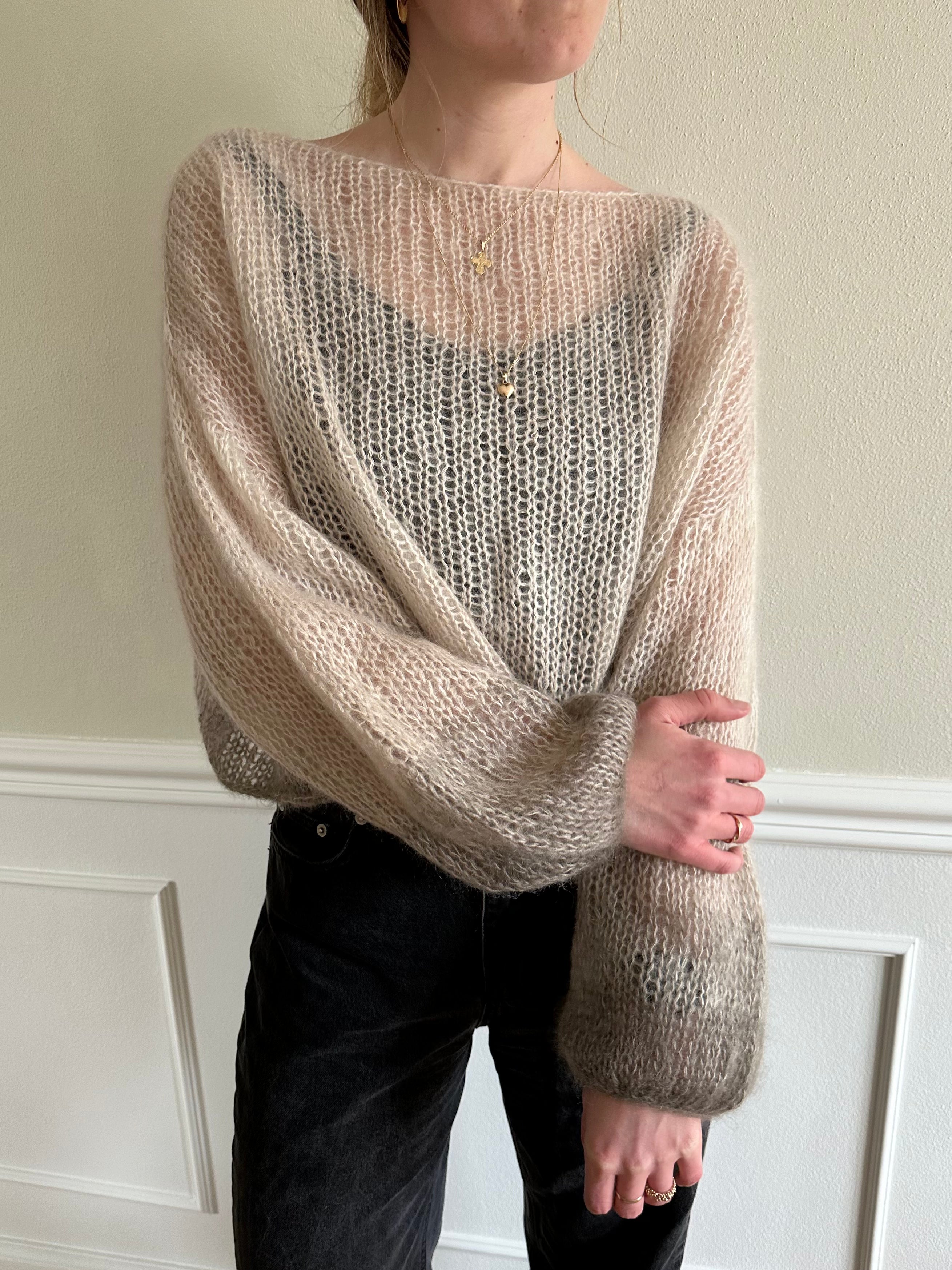 Sweateren strikkes oppefra ned. Først slås masker op til halsen, som strikkes rundt på pinden mens der laves udtagninger på de to skuldre. For- og bagstykket deles og strikkes frem og tilbage på pinden, hver for sig. Når ærmegabene når den rigtige størrelse samles for- og bagstykke igen til kroppen, som strikkes rundt på pinden. Der samles masker op i ærmehullerne og ærmerne strikkes rundt på pinden, med indtagninger inden aflukningen.