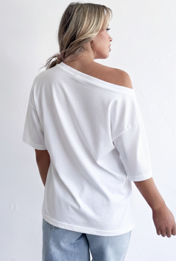 Slip into effortless style with the Rita Tee a breezy off-shoulder cotton essential that's perfect for showing a little skin without the fuss. Soft, breathable, and undeniably chic, this white staple pairs with everything from denim to skirts.