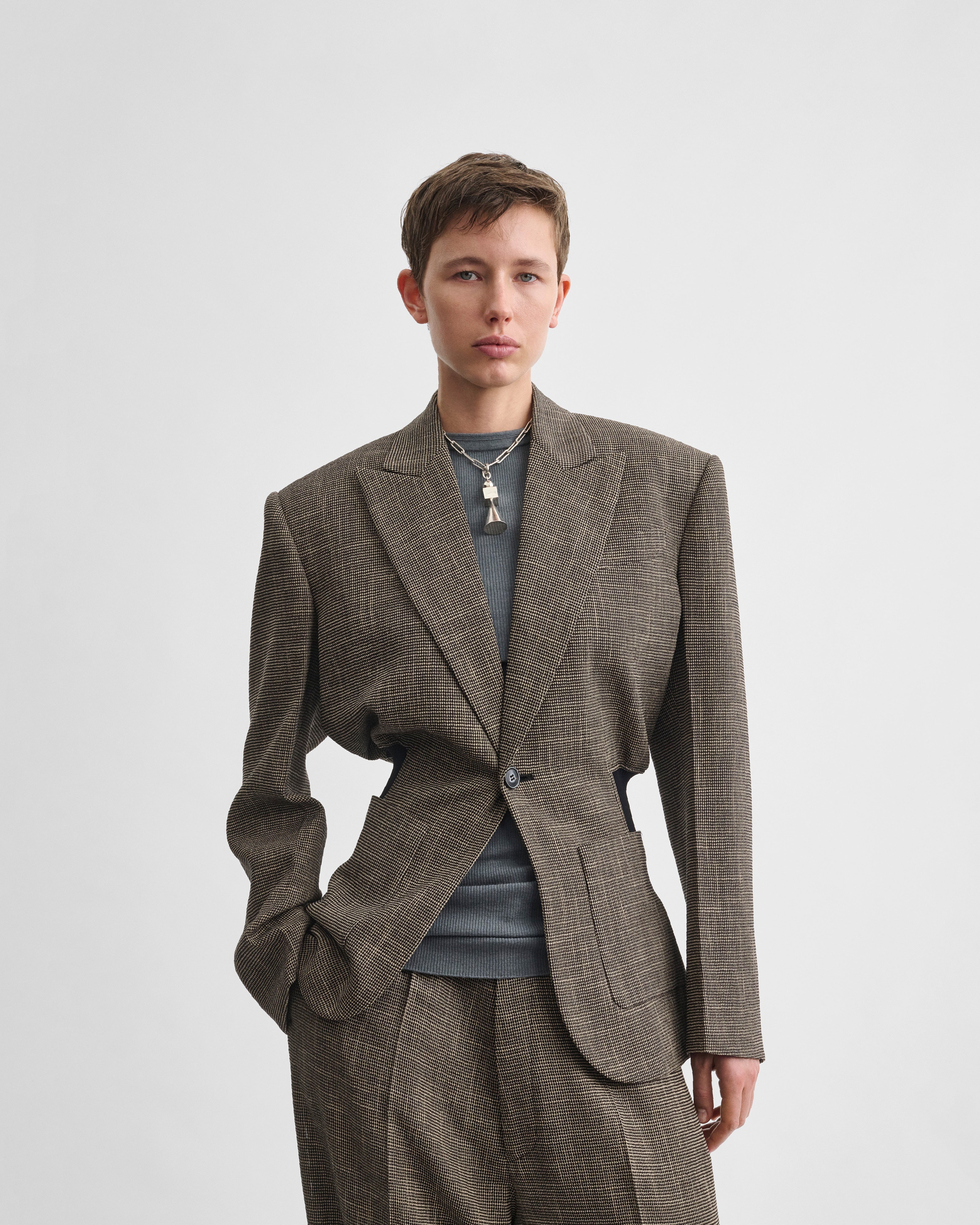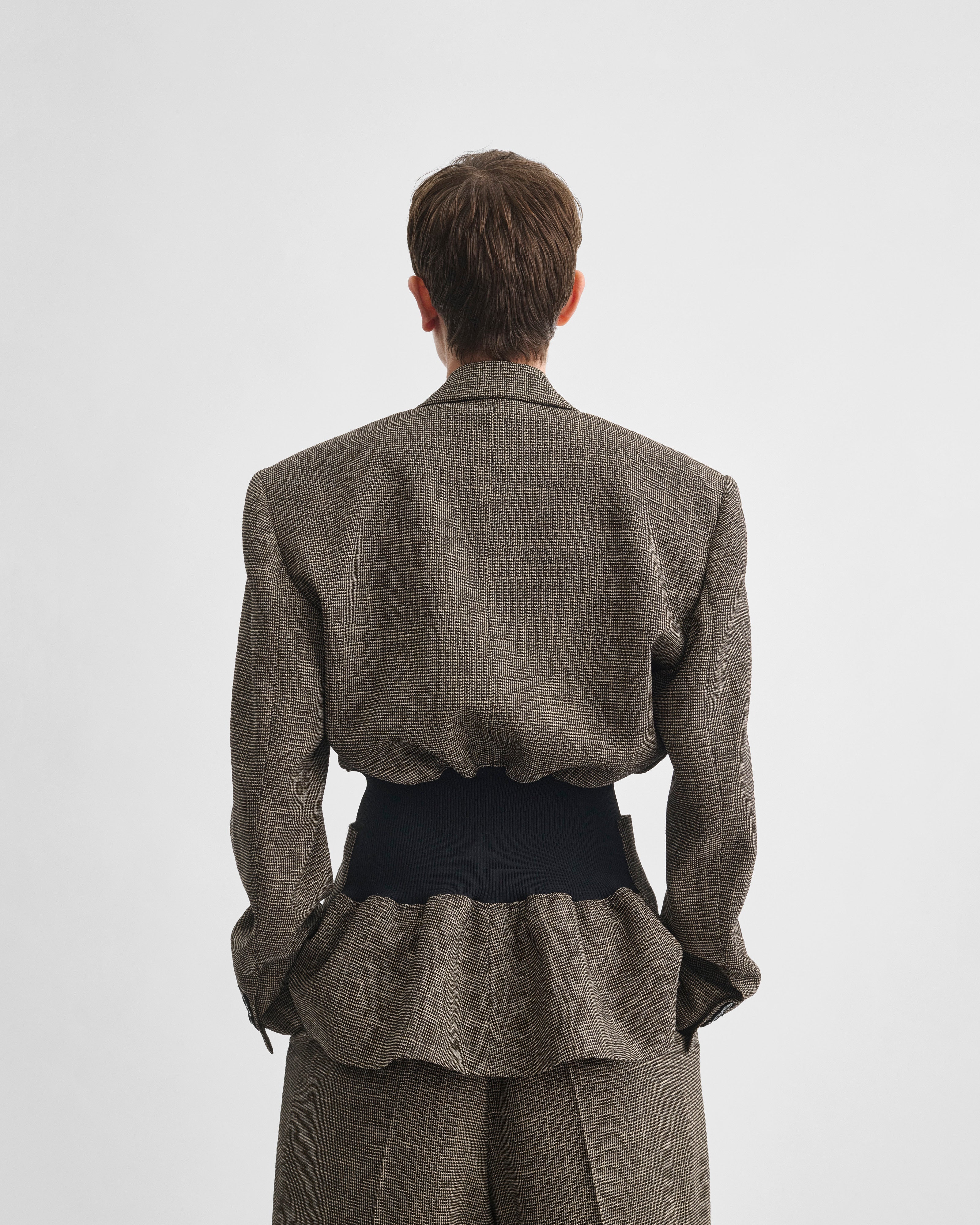 Elasticated kick jacket in salt and pepper woven viscose with a compact ribbed knit panel creating a cinched waist. Sharp pressed lapels and sleeves, single button fastening and buttoned cuffs. The open weave fabric is textured with an airy feel. Fully lined in black viscose.