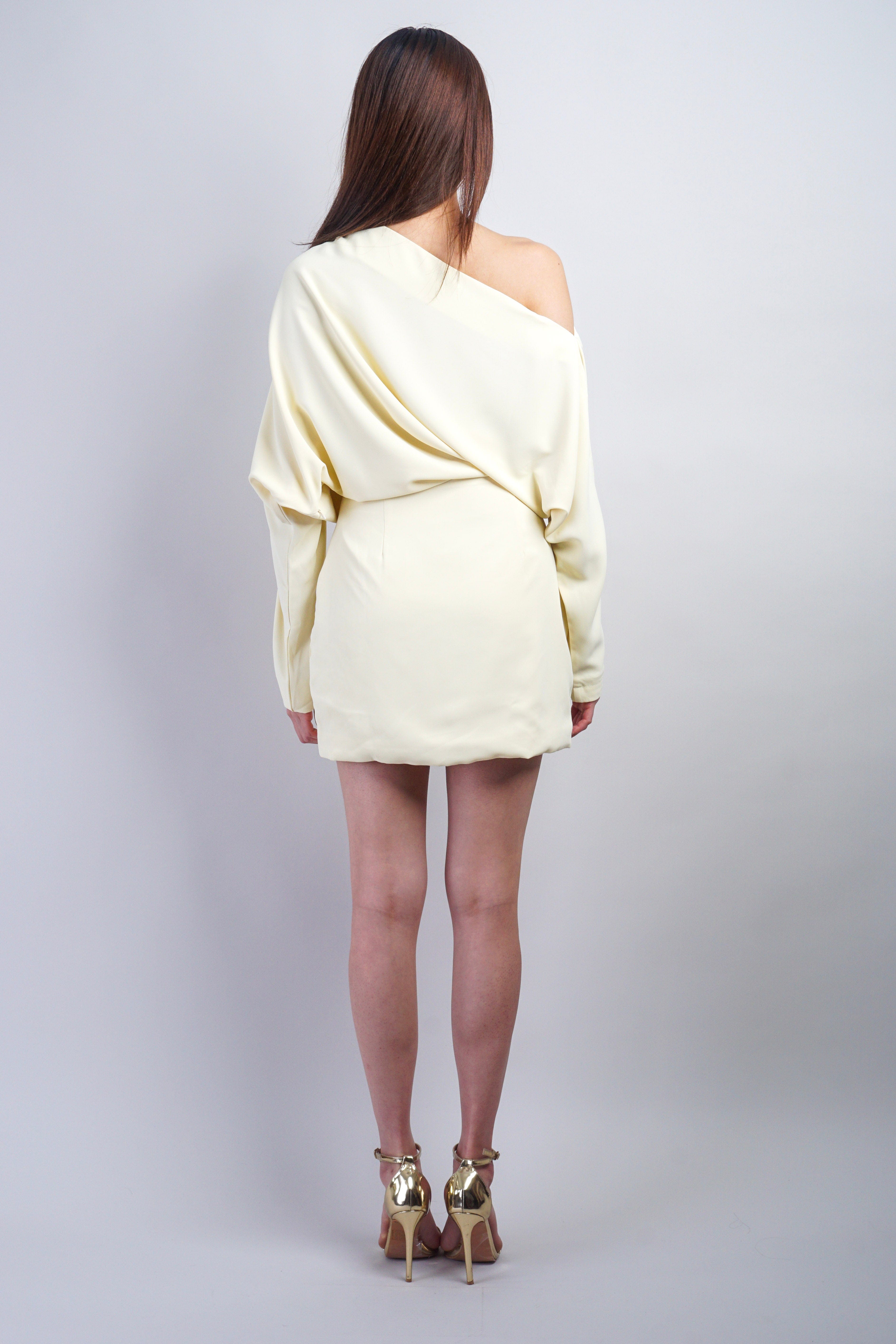 Effortless elegance meets modern minimalism in this butter-hued one-shoulder mini dress. The asymmetrical neckline creates a striking silhouette while the streamlined cut flatters the figure with understated sophistication. Perfect for cocktail events, date nights, or elevated casual occasions, this piece transitions seamlessly from day to evening. The soft, luxurious fabric drapes beautifully, offering both comfort and refined style. A versatile wardrobe essential that pairs effortlessly with heels, strappy sandals, or statement jewelry.