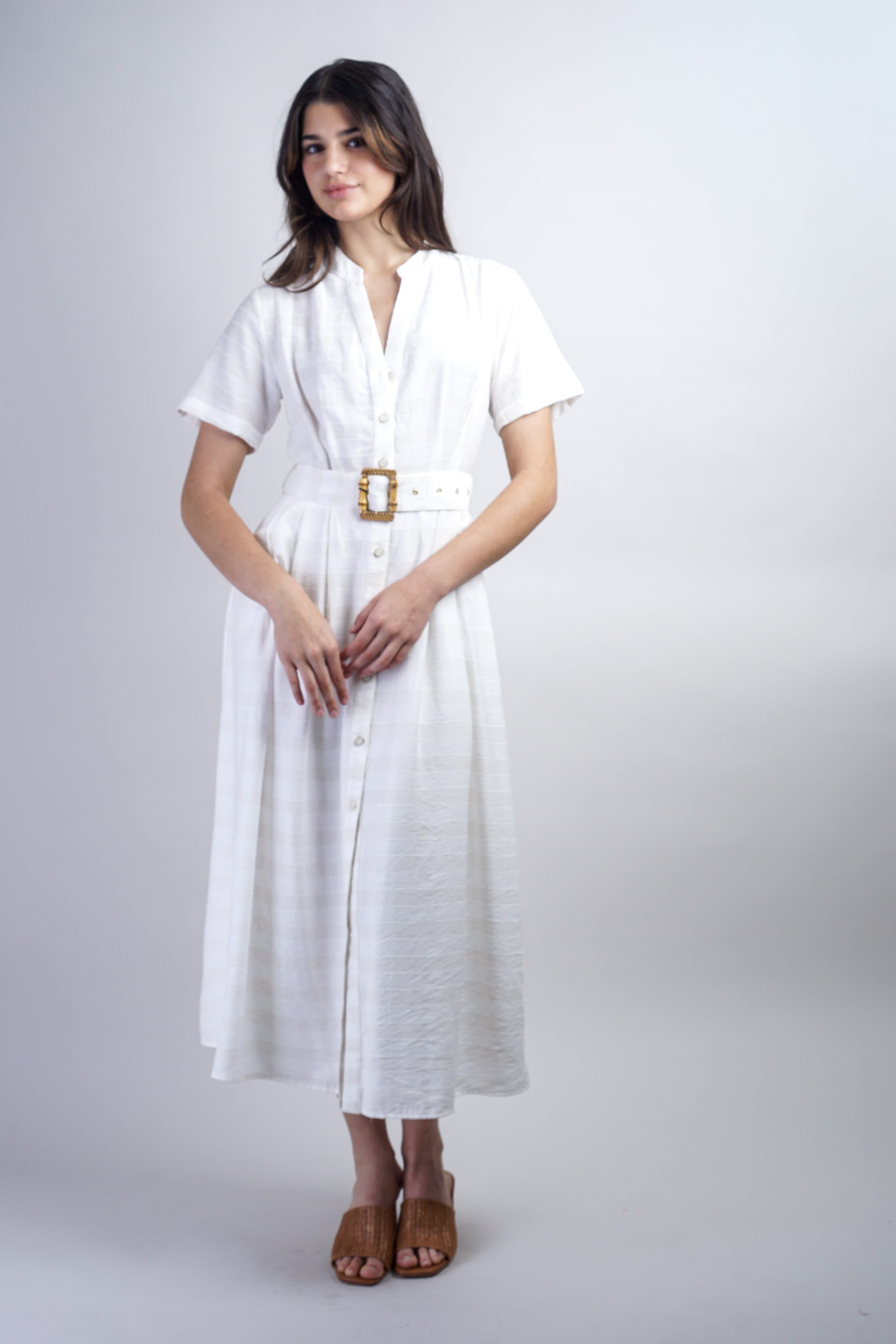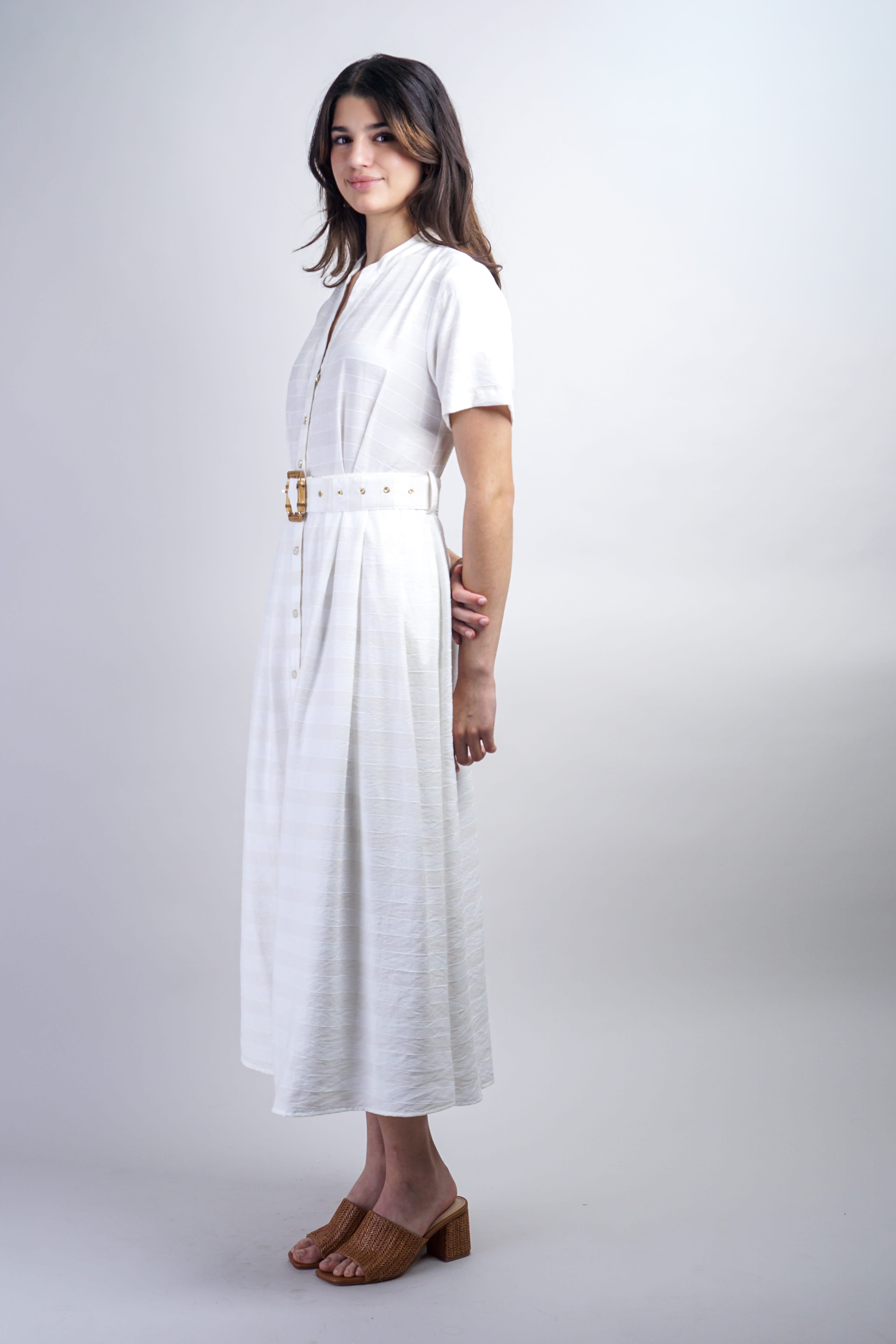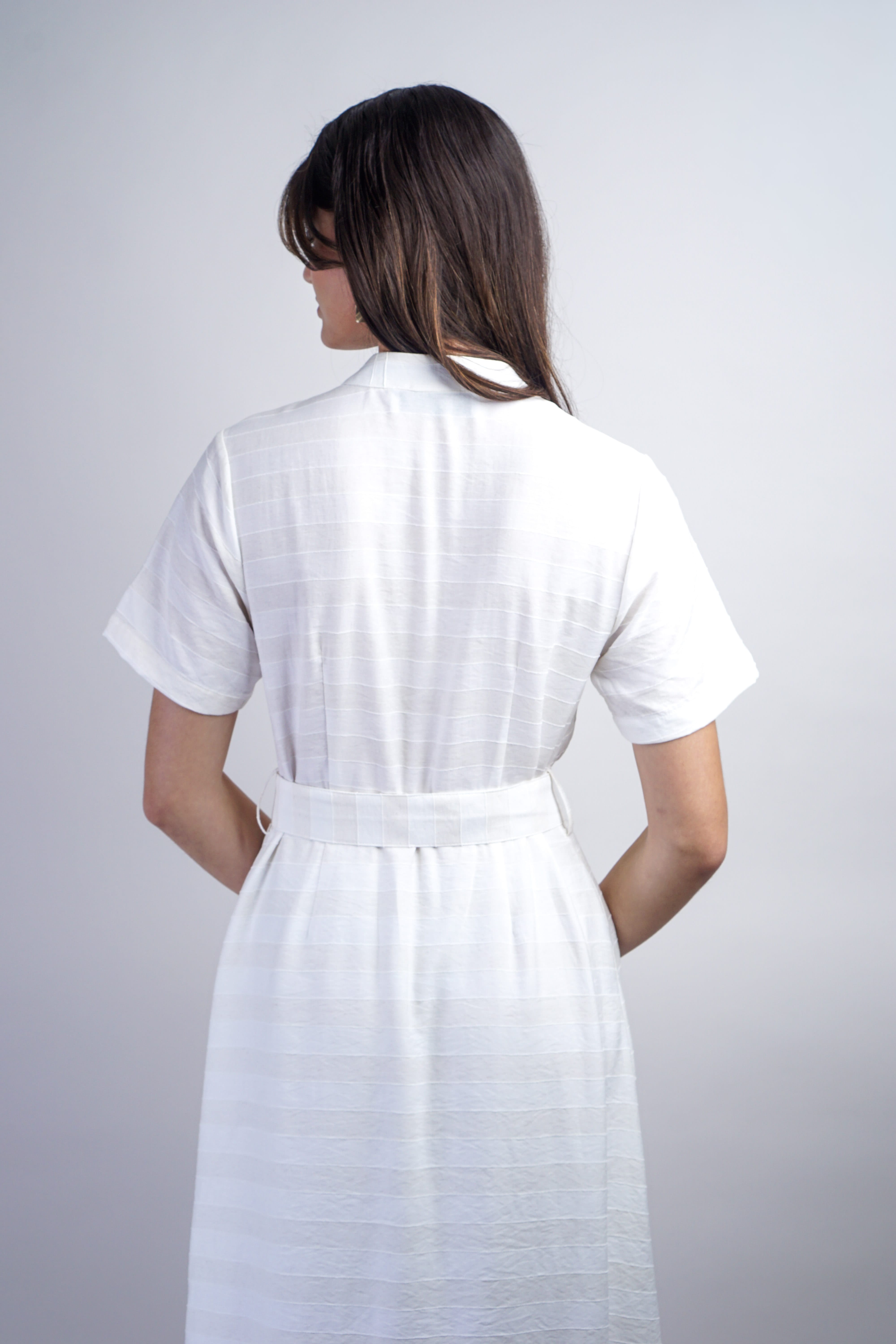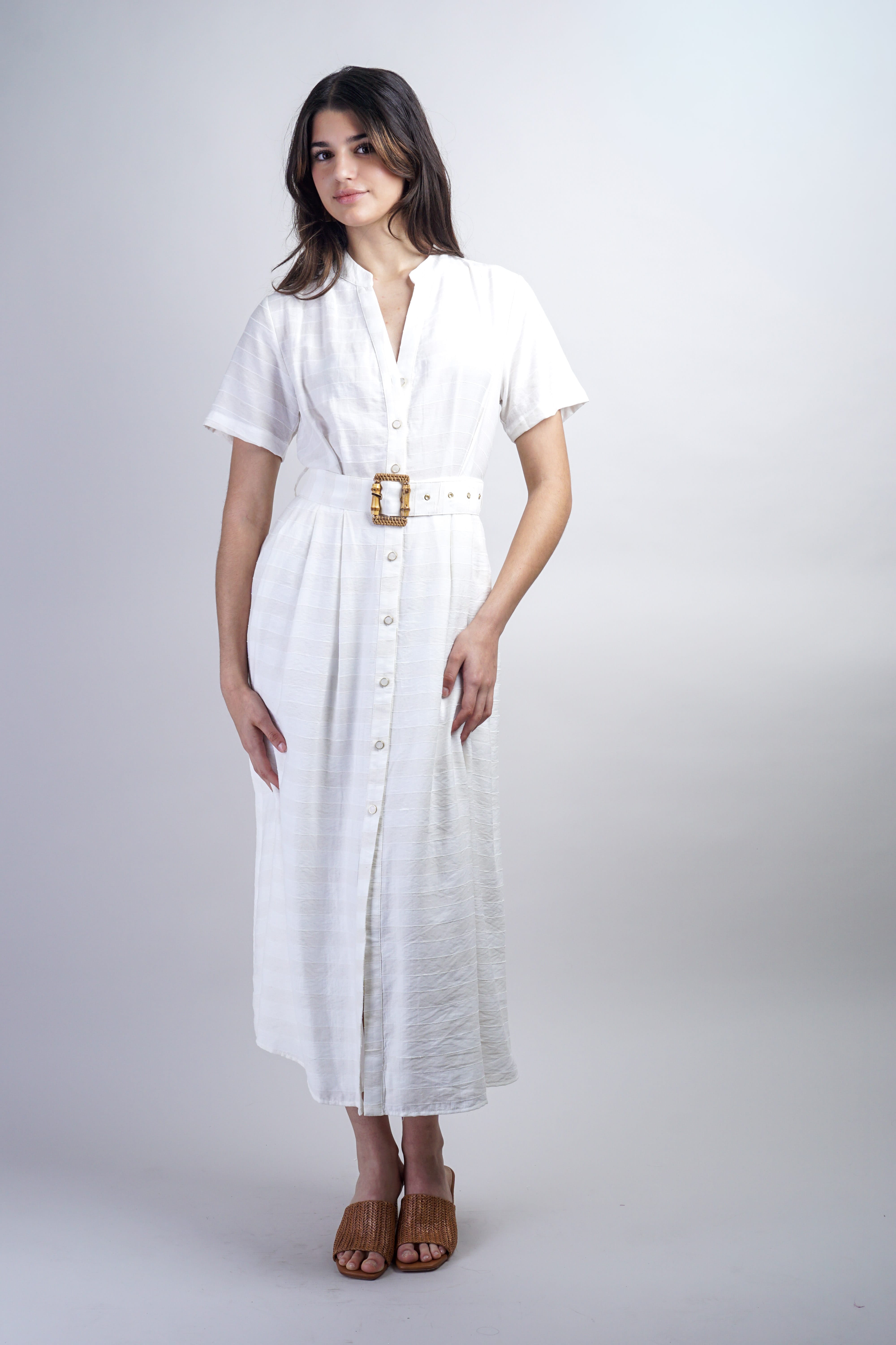 Effortless sophistication meets everyday versatility in this ivory stripe belted shirt dress. Crisp vertical stripes create visual interest while the structured silhouette flatters all frames. The integrated belt cinches at the waist for a polished, defined look—perfect for the office, weekend outings, or dressed up for evening. A timeless wardrobe essential that works as hard as you do.