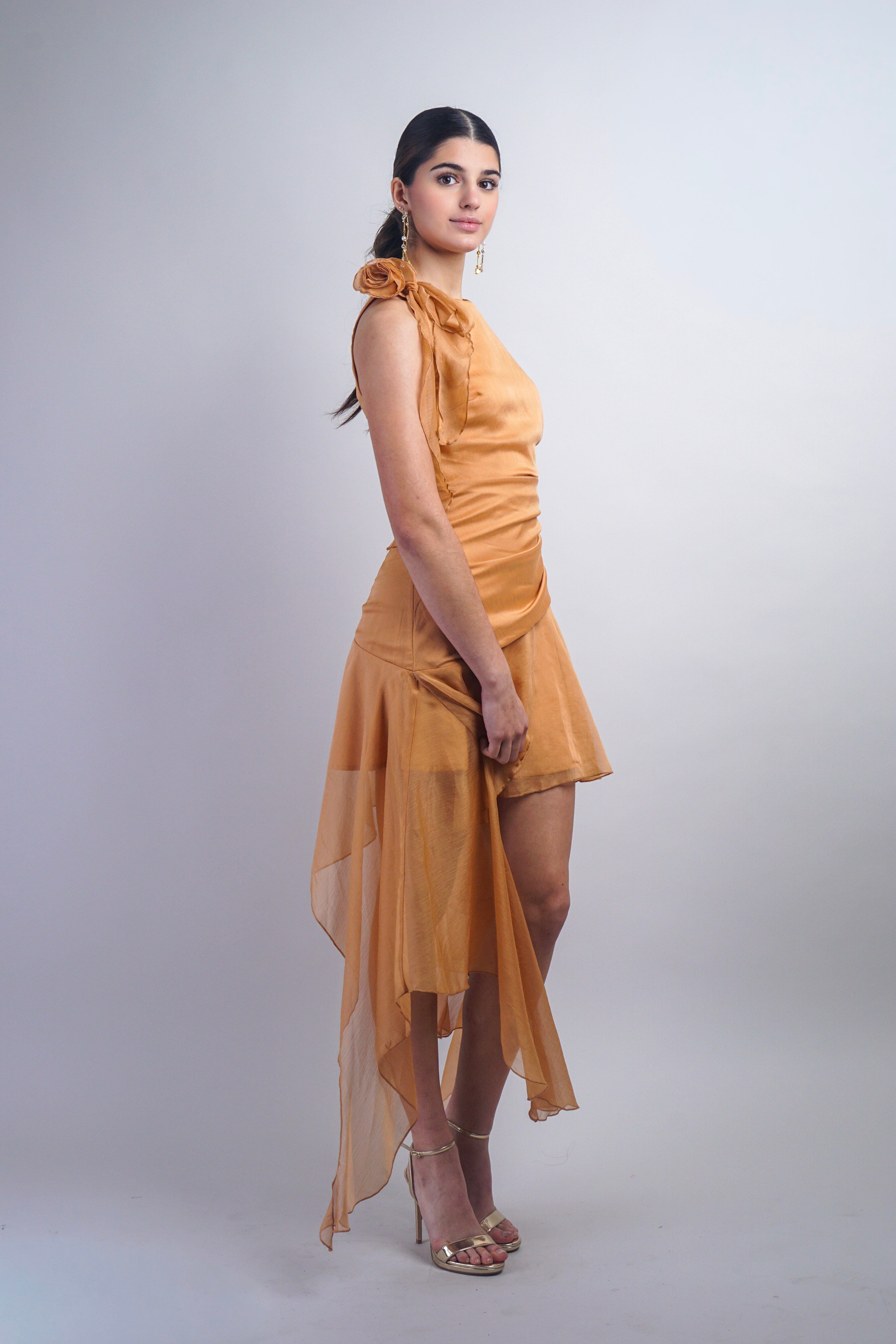 A striking silhouette that commands attention, this orange mini dress features an elegant high-low hemline that creates movement and dimension. Delicate rose ruffles cascade along the side, adding romantic texture and visual interest to the structured design. The bold color palette and refined detailing make this piece perfect for elevated occasions where you want to stand out with understated glamour. A versatile statement piece that transitions seamlessly from evening events to upscale daytime gatherings.