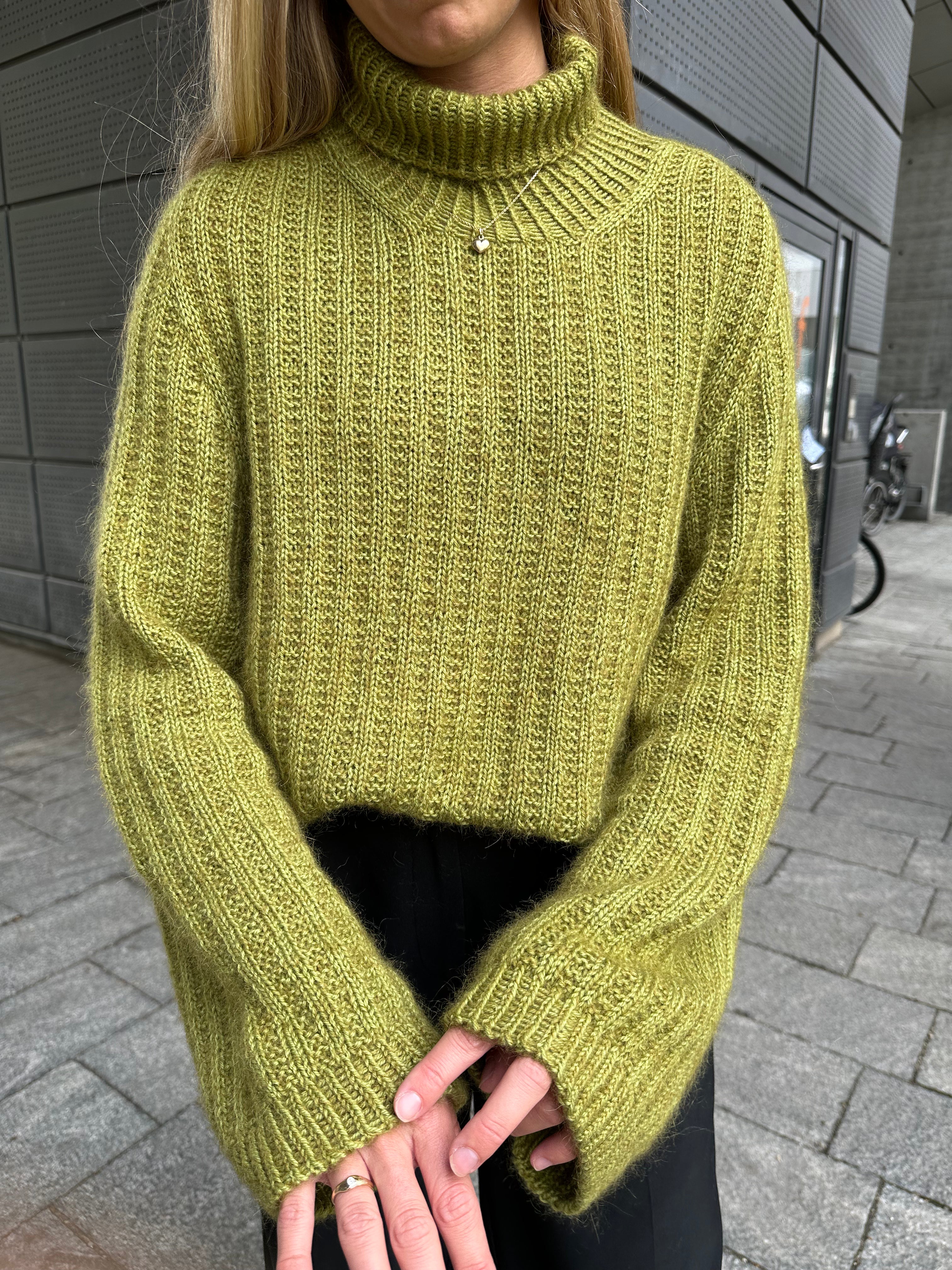 Denne sweater er konstrueret med en saddelskulder, hvor der strikkes frem og tilbage mens skuldrene og halsåbningen skabes gennem udtagninger. Kroppen strikkes færdig på rundpind, hvorved længden af sweateren kan tilpasses og prøves undervejs. I bunden af kroppen kan der strikkes en slids i hver side af den drejede ribkant, hvis det ønskes. Ærmerne strikkes i rib-mønsteret og afsluttes med en lang drejet ribkant og italiensk aflukning. Afslutningsvist strikkes en halskant i drejet rib, der foldes til en dobbelt halskant.