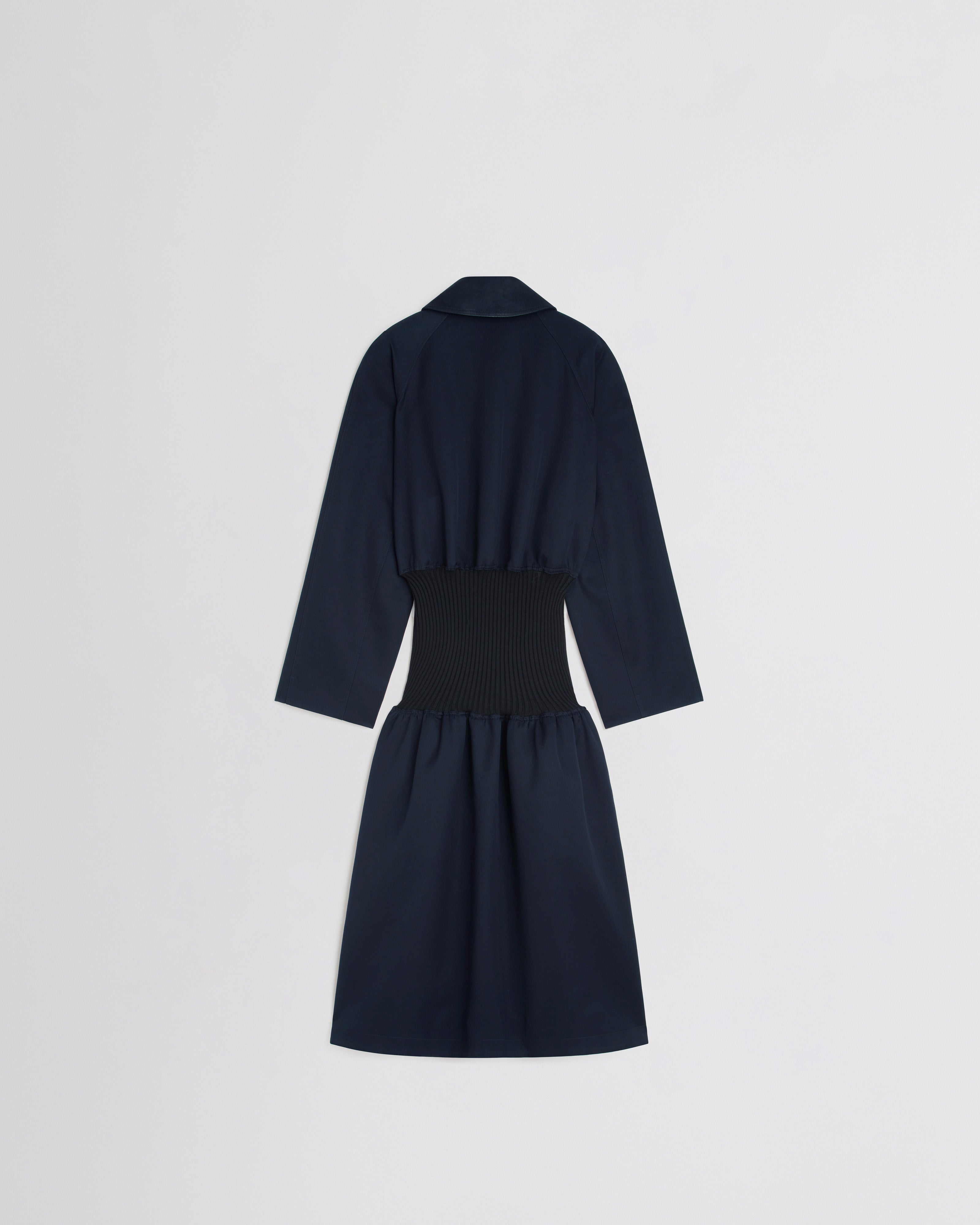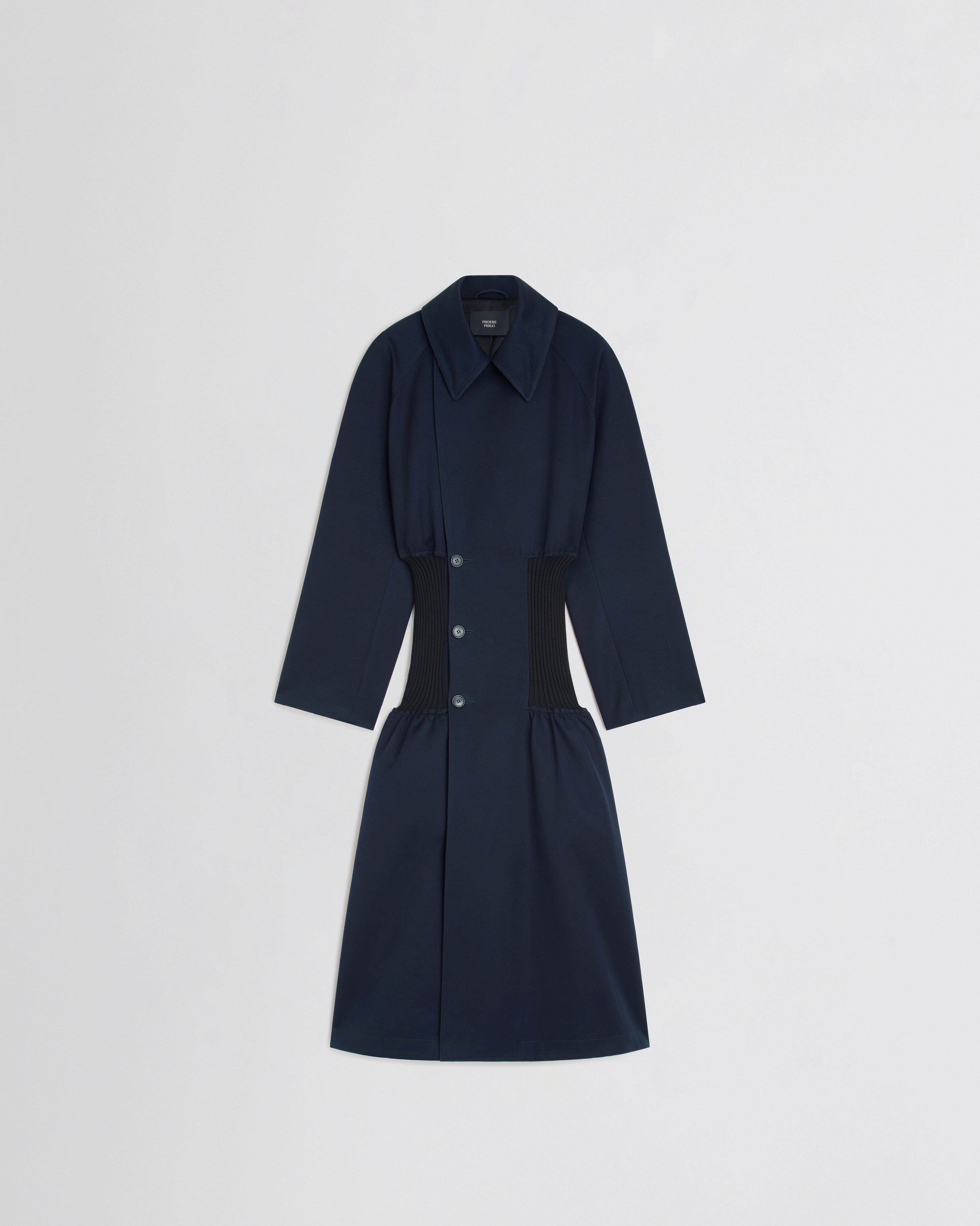 Elasticated kick coat in navy cotton twill with a ribbed knit panel creating a cinched and dropped waist. Cut for a generous fit and hard pressed for a clean finish. The fabric has a substantial feel with a subtle sheen. High pitched pockets and button fastenings. Fully lined.